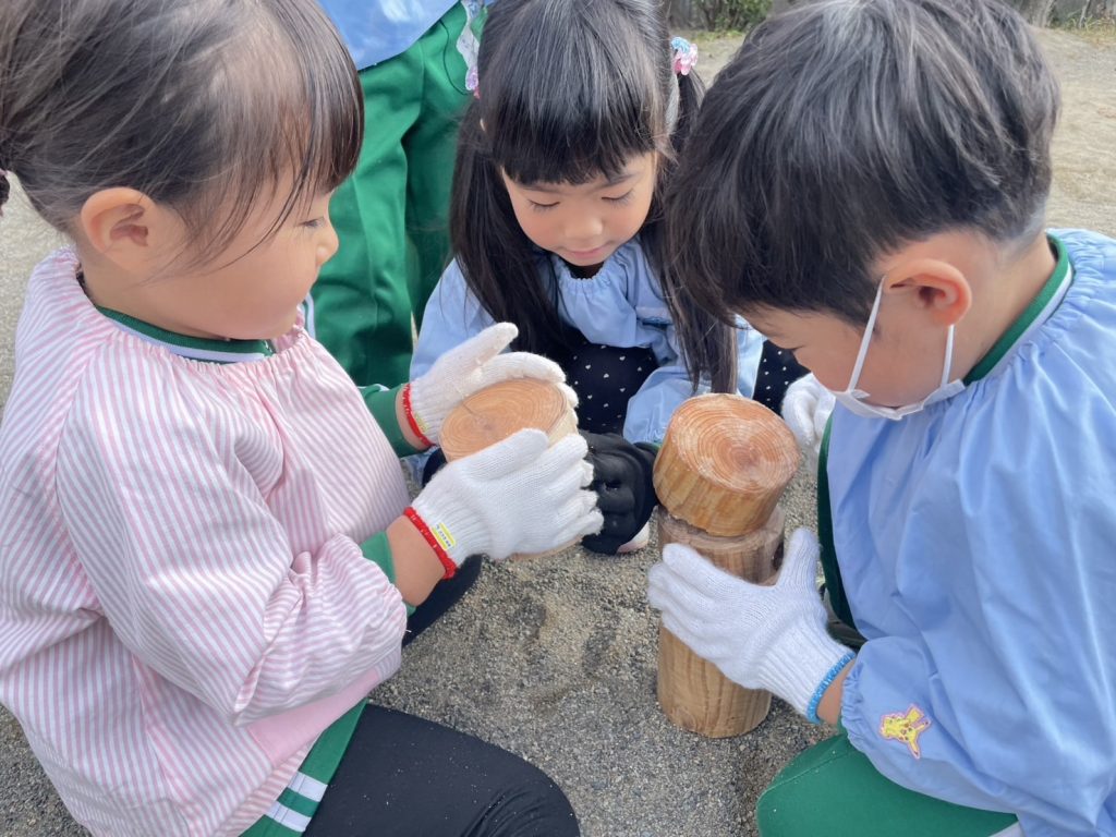 令和7年度クラスの様子 木工体験~発見や気付きがいっぱい!~ 「木」についてこれまでたくさん見たり聞いたり触れたりする中で、気づきや発見を重ねてきた子どもたち。今週はのこぎりを使ったり、年輪スタンプ遊びを楽しんだりしました!農林総合事務所林業部林業木材活用課の方にお手伝いいただきながら、丸太や木の枝を... 2025.11.21 令和7年度クラスの様子