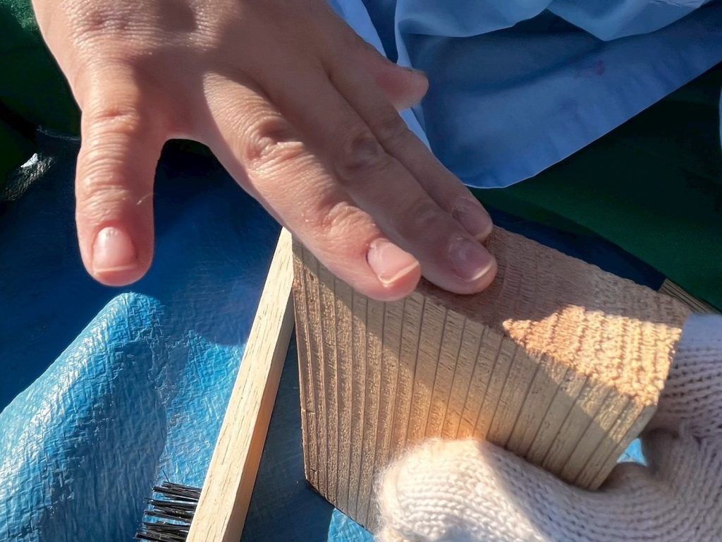 木をワイヤーブラシで削っていくよ。柔らかいところが削れていくと聞いて、みんな一生懸命に削ります!