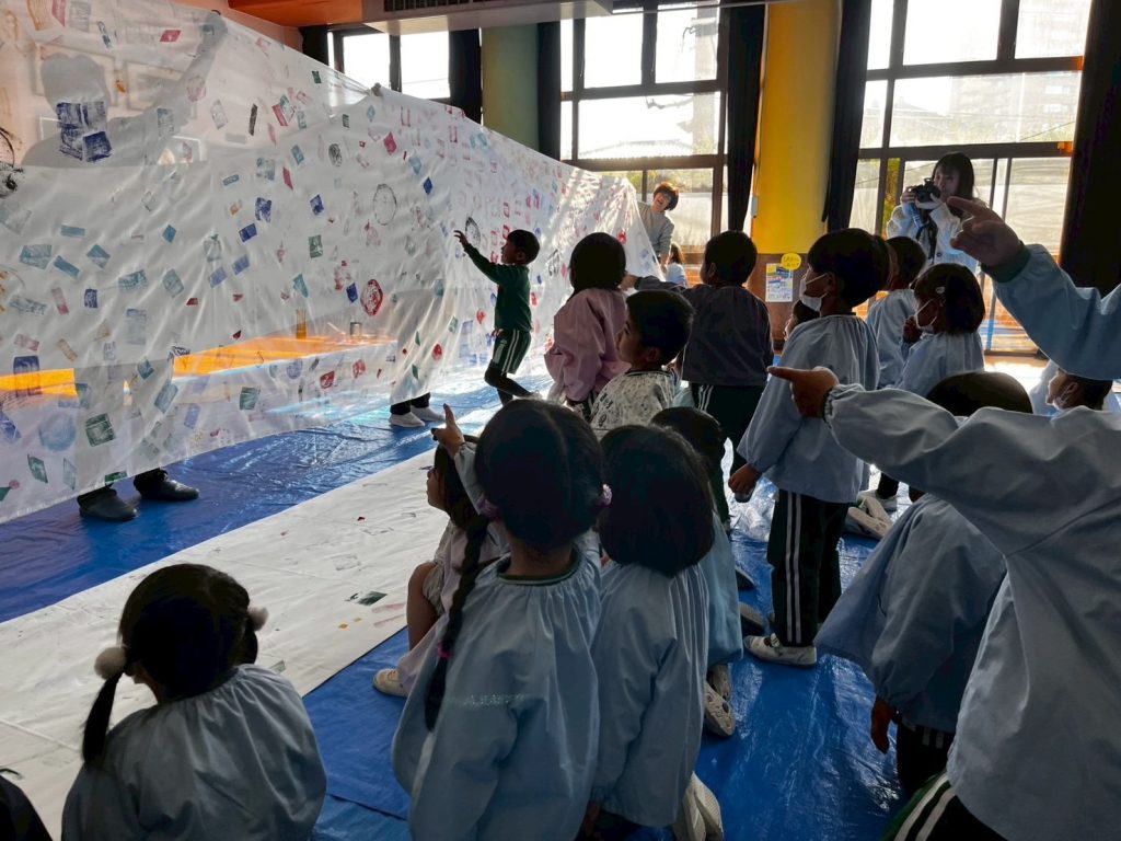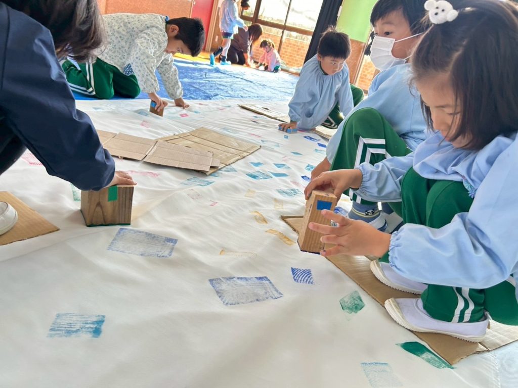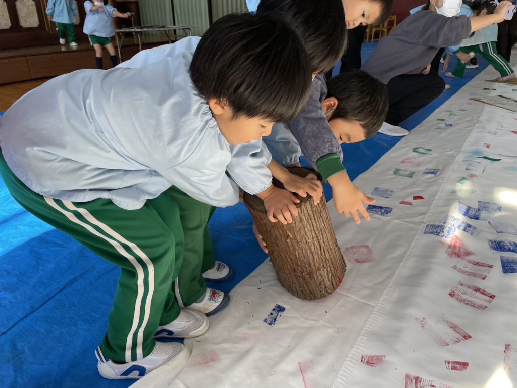 ホールいっぱいの長ーい布に年輪をポン!!たーくさんの年輪の模様ができました!全部模様が違うねー。